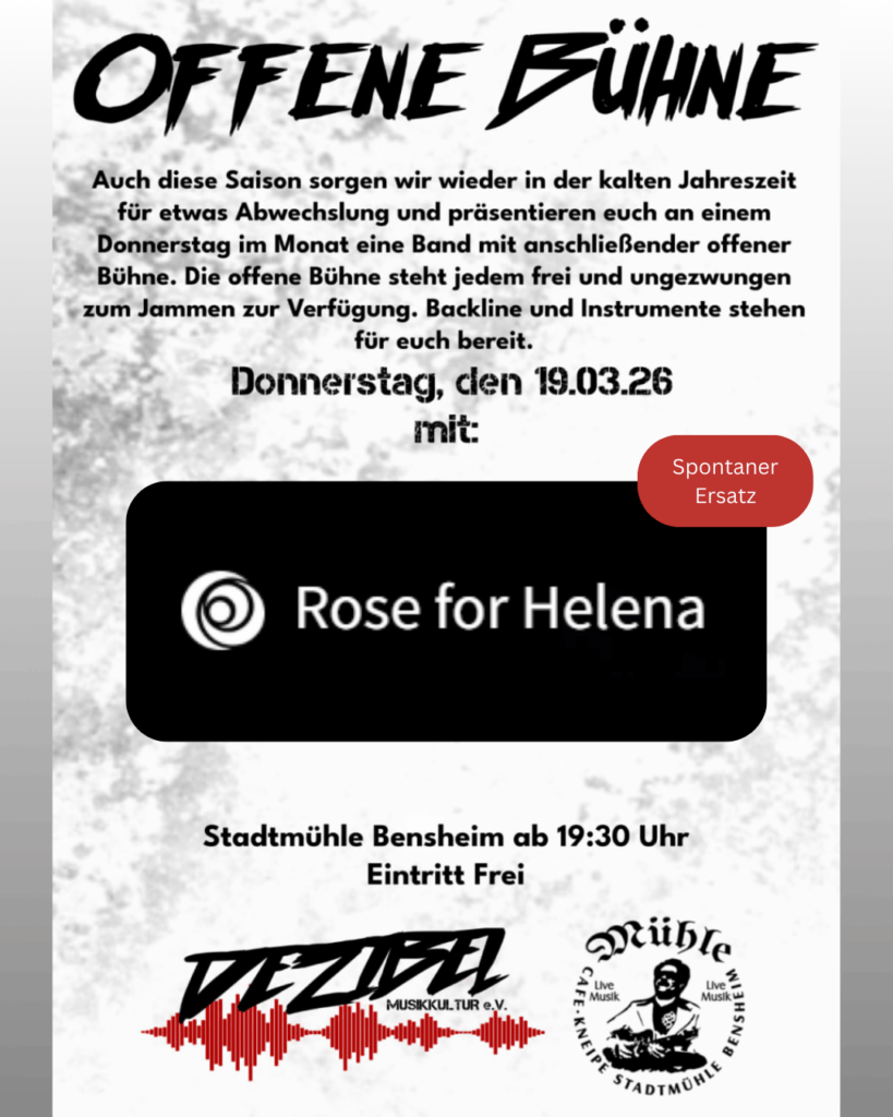 Um in der kalten Jahreszeit für etwas Abwechslung zu sorgen, präsentieren wir euch jeden letzten Donnerstag im Monat eine Band mit anschließender offener Bühne. Die offene Bühne steht jedem frei und ungezwungen zum jammen zur Verfügung. Backline und Instrumente stehen für euch bereit.